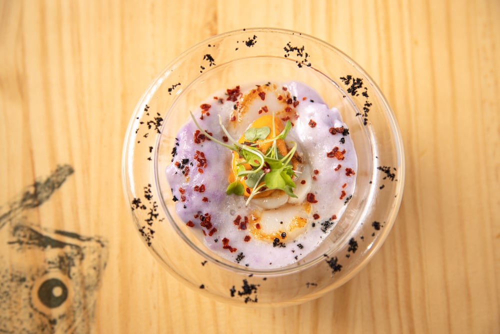 Dúo de ceviche: Peix blanc amb aroma trufat, i salmó amb llet de tigre i maracuià.